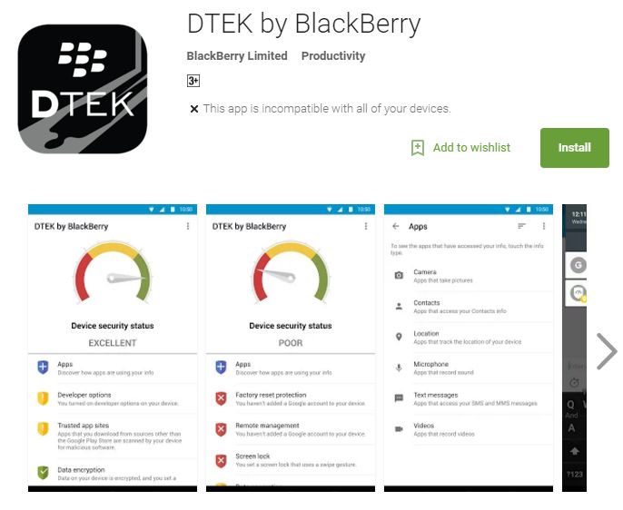 In this world of interconnected apps and networks, controlling what is shared and with whom it’s shared with can be a challenge. BlackBerry® DTEK for Android™ allows you to view and improve your privacy level and monitor application access to your camera, microphone, location, and personal information. Take control with DTEK by BlackBerry.